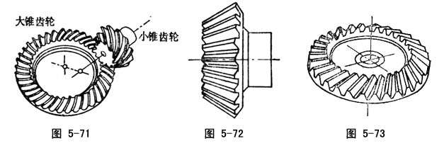 分度曲面为圆锥面的齿轮。广义的可分为直线齿锥齿轮、斜齿锥齿轮、曲线齿锥齿轮。锥齿轮可组成锥齿轮副、准双曲面齿轮副、锥蜗杆副。通常是指组成锥齿轮副和准双曲面齿轮副的齿轮(图5-71)。