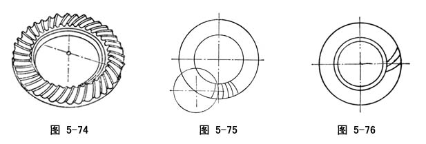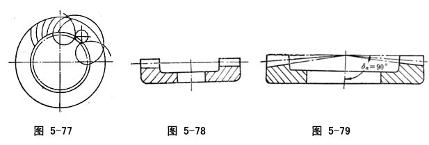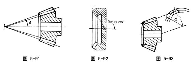 锥齿轮轮齿从大端到小端,齿槽宽不是减小而是增大,即小端齿槽宽大于大端,这种收缩称反向收缩(图5-90)。