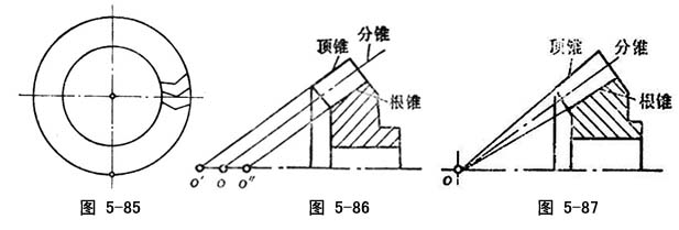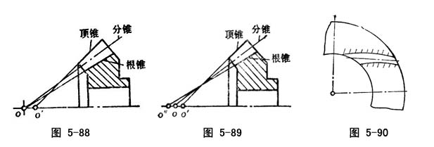 锥齿轮的轮齿从大端到小端齿高急剧缩小,且顶锥、分度锥、根锥的顶点不重合,亦即顶锥角急剧增大,根锥角急剧减小,形成顶锥顶点与根锥顶点分别落在分度锥顶点的内侧和外侧(图5-89)。